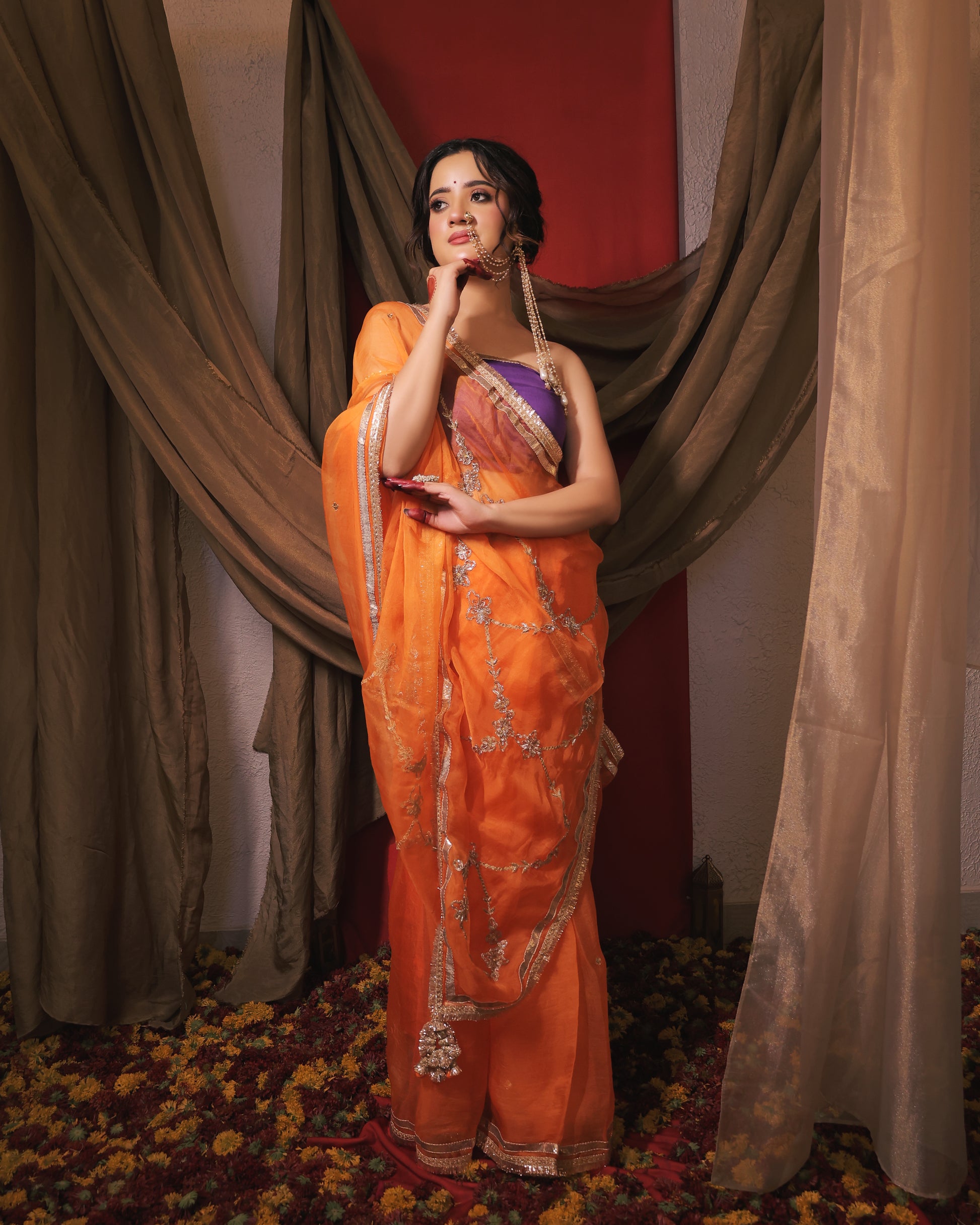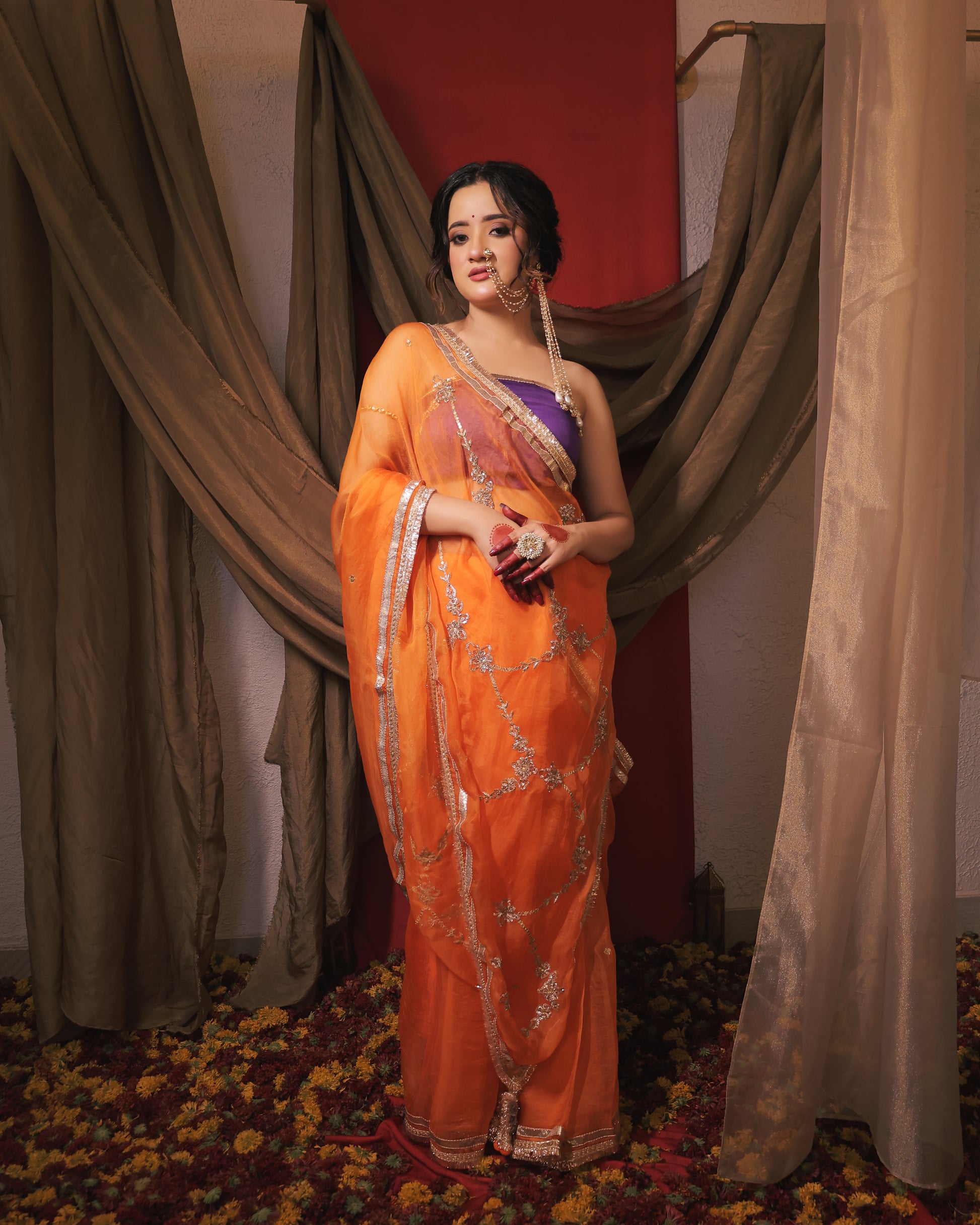 The Orange and Purple Swarn Manjari Saree blends radiant color with traditional craftsmanship to create a truly majestic look. With its handcrafted NAKSI embroidery and luxurious organza fabric, it’s an elegant choice for any festive or formal occasion. Bold yet refined, this saree is a timeless piece that honors the spirit of Indian heritage.